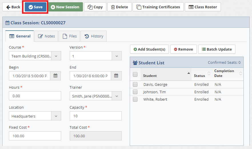 | 1. | Locate the Session record to edit by placing your cursor in the Filter Sessions box on the Session List page, and then type a few characters of the Course Title or the Session Number.